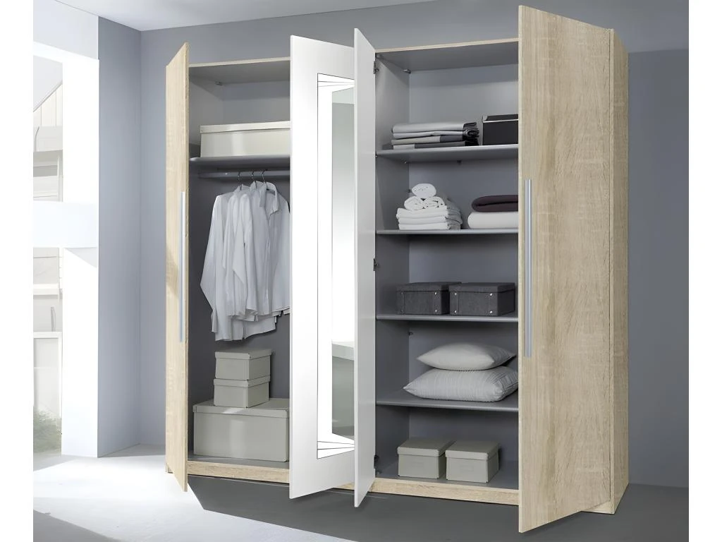 Cette garde robe sublimera votre chambre avec son coloris chêne sonoma et blanc. Composée de 4 portes dont 2 avec miroirs. Les 2 grands miroirs intégrés seront parfaits pour vos séances d’essayage et apporteront clarté et luminosité à votre chambre. L’intérieur est muni de nombreux espaces de rangements : 1 grande penderie et 6 étagères afin d’en faire un dressing qui accueillera aisément toute votre garde-robe.