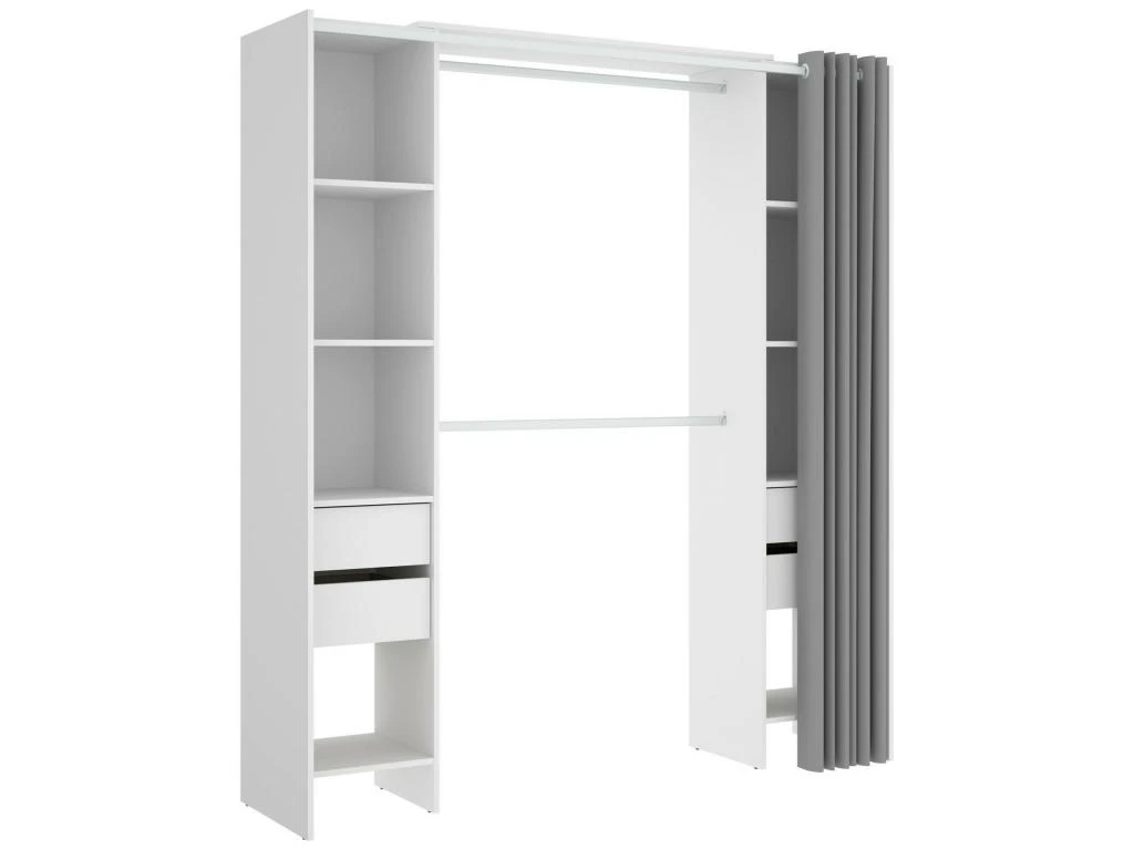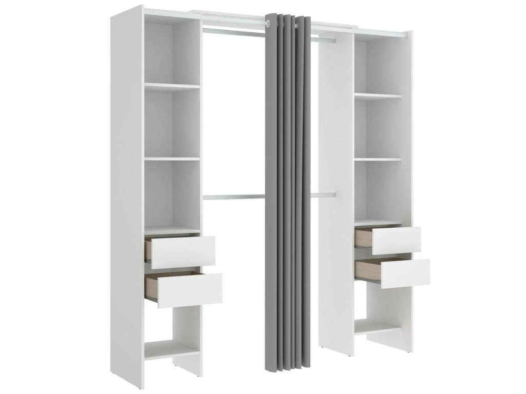 STRUCTURE ET UTILISATION – Armoire avec rideau, composĂ©e de deux colonnes avec quatre Ă©tagĂšres et deux tiroirs et deux tringles centrales – GrĂące Ă l’organisation interne de ses espaces, elle offre un grand espace de rangement – Toute la structure du meuble est parfaite pour dĂ©corer de maniĂšre peu encombrante une chambre parentale, une chambre d’enfants ou une chambre d’amis – Les Ă©tagĂšres associĂ©es Ă la tringle Ă vĂȘtements vous permettront de ranger vos vĂȘtements et costumes de maniĂšre ordonnĂ©e.