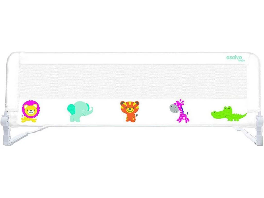 Barrière de lit bébé universelle blanche 150 cm, motif animaux. Elle est pliante en deux parties afin de faciliter son transport. Elle est composée d’une structure en aluminium et d’un tissu en polyster microfibré permettant une meilleure respirablité.