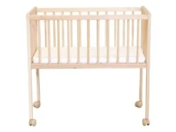 Lit bébé à barreaux en bois massif de hêtre verni 80×40 cm, avec matelas 8 cm inclus, monté sur roues et facile à déplacer dans la chambre. Un style élégant et sobre pour le premier lit de votre enfant.