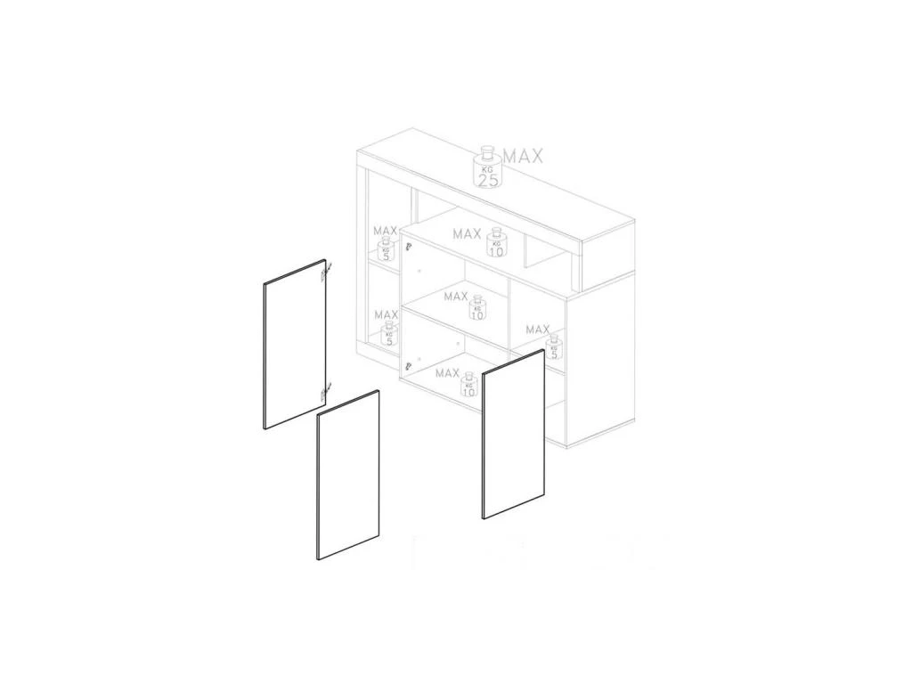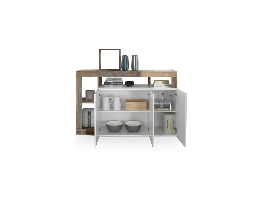 Dans un coin repas vous pourrez ranger vaisselle et couverts derrière les 3 portes, les espaces de rangements ouverts permettront de déposer des objets de déco.