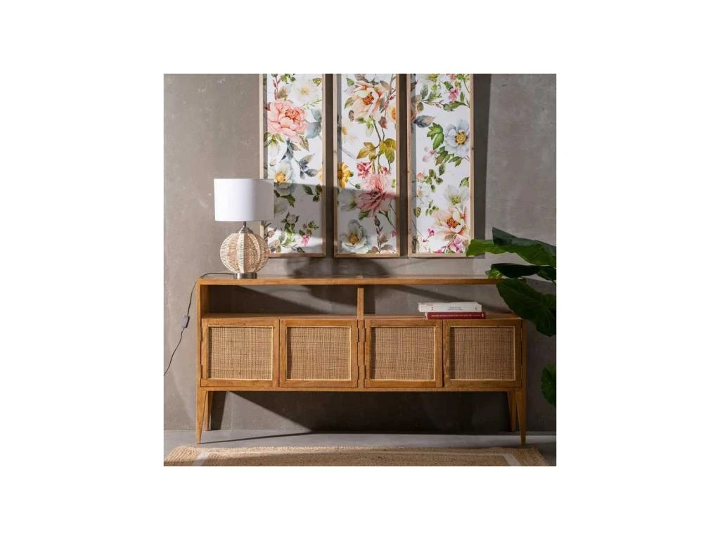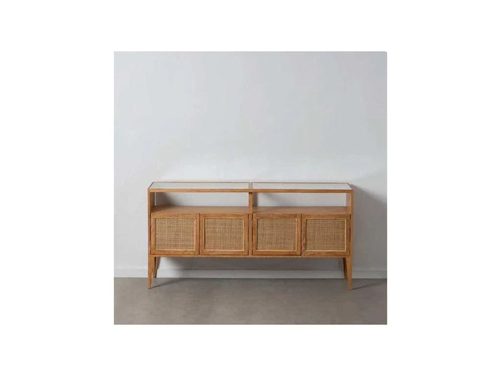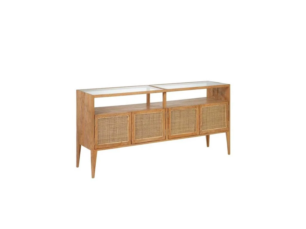 AgrĂ©mentez la dĂ©co de la salle Ă manger d’une maison de campagne ou d’une maison de vacances avec ce buffet 4 portes proposant le mariage de bois de Manguier, de rotin et de verre.
