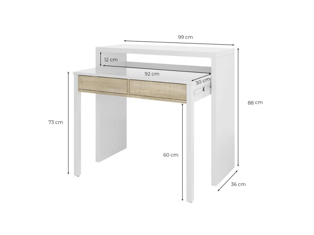 Sa partie extensible vous permettra d’ouvrir un bureau qui est composé de 2 tiroirs pour vos petites affaires. De même, le bureau est facilement repliable et se transforme en console d’entrée.