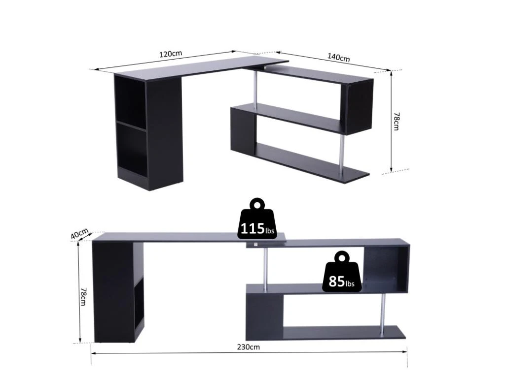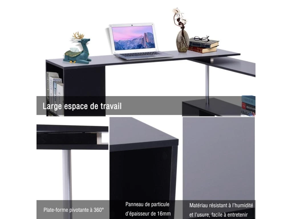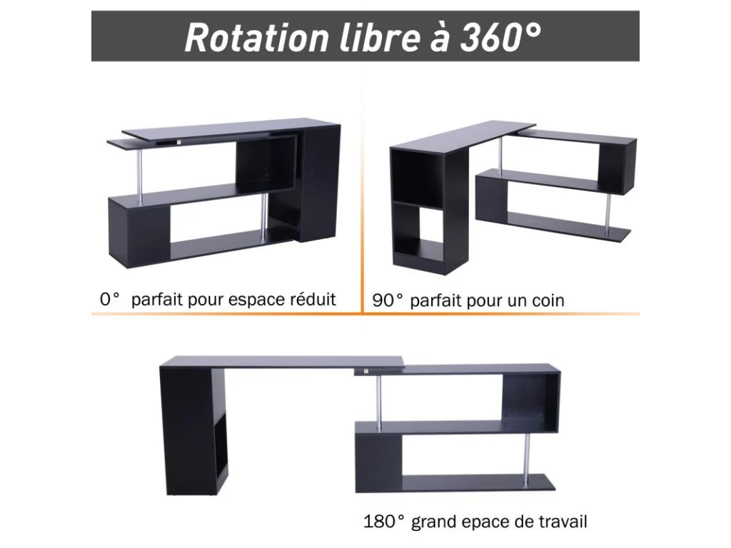 La Table Informatique Bureau d’Angle en forme de L Adjacente Pivotante 360°avec ĂtagĂšres MDF Noir est un meuble en L que vous pouvez installer dans votre bureau ou dans votre chambre. GrĂące Ă elle vous pouvez Ă©conomiser de la place, puisqu’elle pivote Ă 360°C. Elle vous offre, Ă©galement, l’espace indispensable pour installer votre ordinateur portable ou votre imprimante. Ce bureau de MYCOCOONING, comporte une Ă©tagĂšre en S Ă 2 Ă©tages ainsi que d’un coin de rangement pour livres et dossiers sur le cĂŽtĂ©. En effet, il s’agit d’un mobilier multifonction qui vous permet de disposer de tout ce dont vous avez besoin dans un mĂȘme emplacement.
