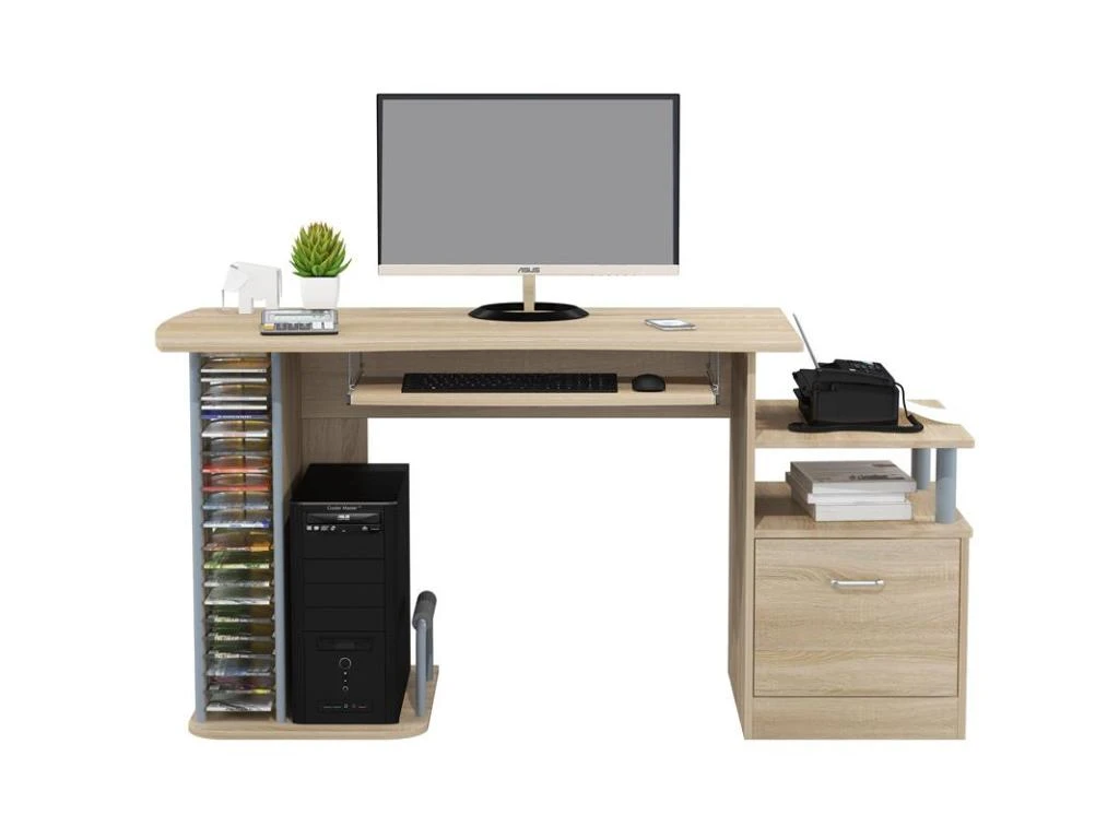 Nous sommes heureux de vous proposer le bureau ordinateur à l’aspect bois de chêne, idéal pour organiser votre coin multimédia. Vous pourrez ranger vos documents et votre matériel informatique dans son grand tiroir. Les multiples étagères et tablettes de rangement vous permettront de poser tour central, écran, imprimante, etc. La tablette coulissante incluse est idéale pour accueillir le clavier. L’étagère pour CD vous fera également gagner de la place.