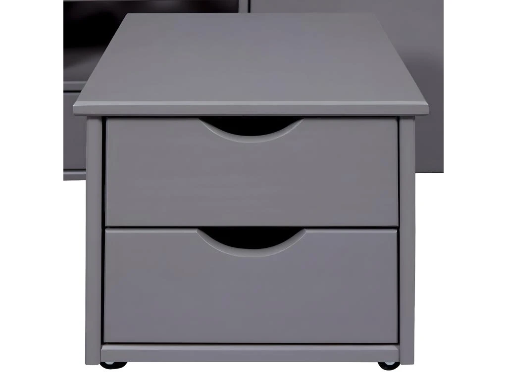 Lit spacieux offrant de grandes possibilités de rangement : 1 grand tiroir sur roulettes et 4 étagÚres avec 2 tiroirs. Les tiroirs sont interchangeables et peuvent se placer indifféremment dans chaque emplacement, ainsi que le chevet sur roulettes.
