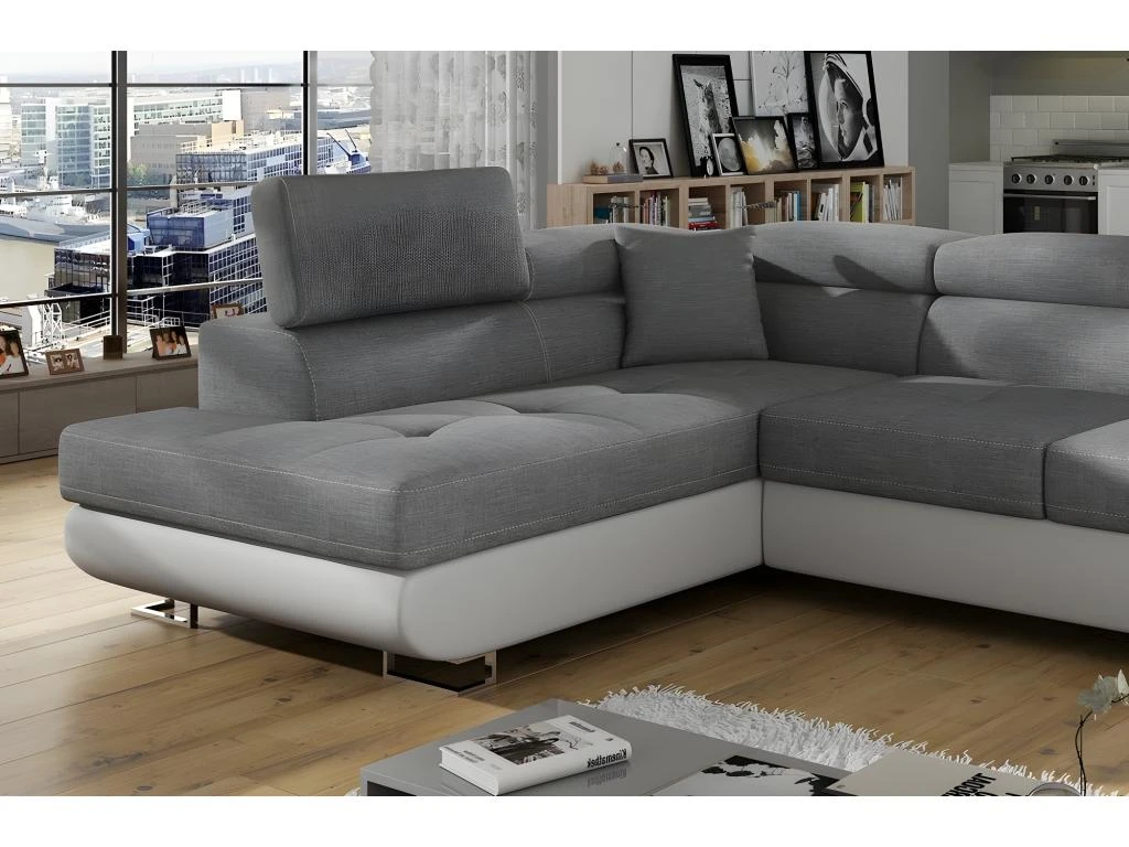 Très joli canapé d’angle convertible en tissu de luxe et caisse en simili cuir – ANNECY MIX. Vous profiterez de son très bon confort. Avec son design épuré mais robuste. Trois appuie-têtes sont réglables. La fabrication solide est complétée par son assise confortable basée sur des ressorts continus résiliants et une mousse extrêmement résistante et confortable. Fonction couchage à ouverture facile est actionnée simplement, avec un grand rangement pour le linge de lit dans son coffre de rangement pratique. Fabrication européenne.