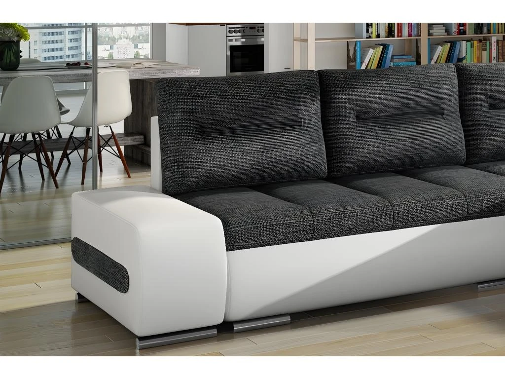 Avec ses dimensions de 275x180x80 cm, grâce auxquelles il ne prend pas trop de place dans le salon, tout en offrant un maximum de confort. Grâce aux ressorts ondulés et à la mousse T30 située dans les assises, permet un très bon confort souple, et en soutenant adéquatement le corps au repos. Autre avantage qui sera apprécié des personnes qui apprécient les solutions fonctionnelles, puisque le canapé dispose de la fonction couchage et se transforme très rapidement en lit. Une fois déplié, vous bénéficiez d’un lit de 195×135 cm. L’ouverture est simple et intuitive, et assure un confort et un fonctionnement simplifié. Après dépliage, le canapé dispose d’un espace de rangement supplémentaire.