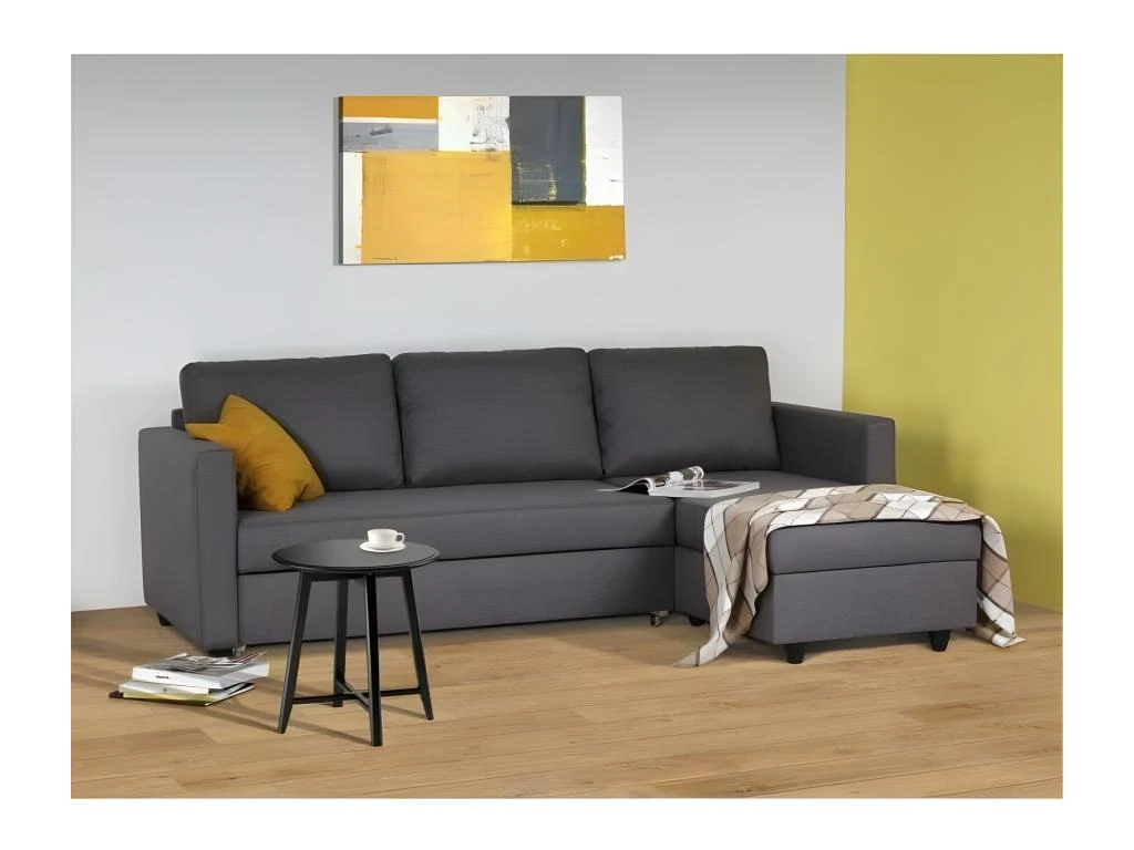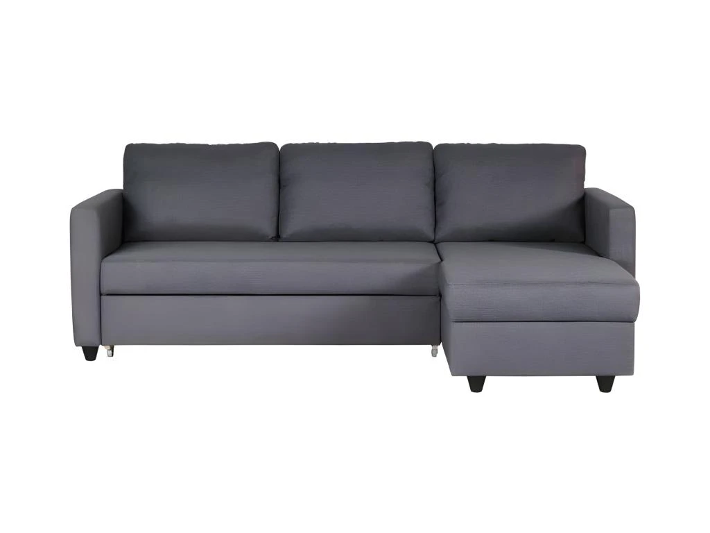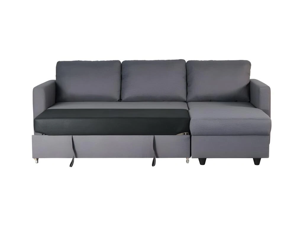 Canapé d’angle convertible réversible CATS tissu gris 100% polyester 245gr/m2 – chaise longue avec coffre de rangement – structure en bois massif et dérivés – assise mousse polyuréthane 25kg/m3 – coussins de dos en mousse polyuréthane 21kg/M3 – pieds plastique noir