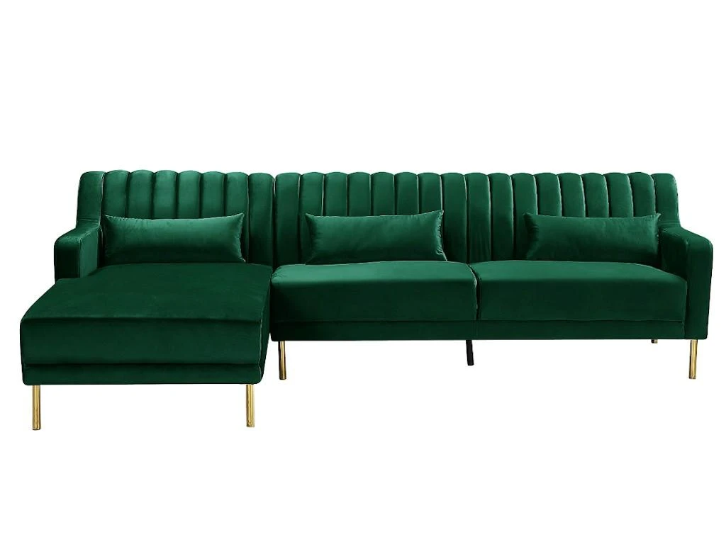 Avec ses pieds en métal doré, son revêtement en velours, son dossier strié et ses 3 coussins de déco offerts, le canapé MEYREUIL ne manque pas d’atouts pour vous séduire ! Telle une invitation à vous asseoir, il n’attend que vous !