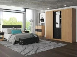 Armoire 2 Portes Coulissantes – Miroir Et Tiroirs – L240cm – Coloris : Naturel Et Noir – BODIL