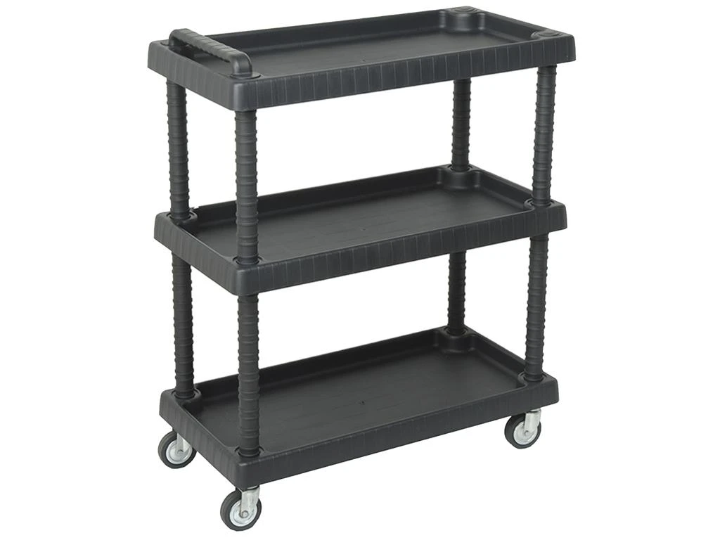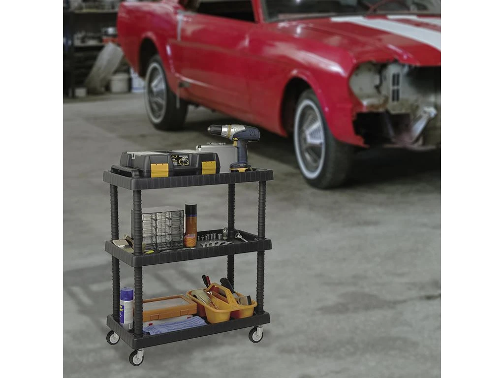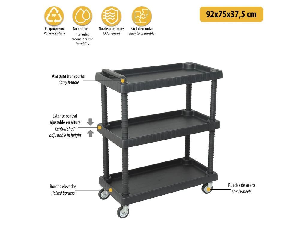 Chacune des trois étagères qui composent le chariot a des bords surélevés, ce qui permet de contenir facilement ce qui s’y trouve. De plus, une poignée est prévue pour améliorer la prise en main.