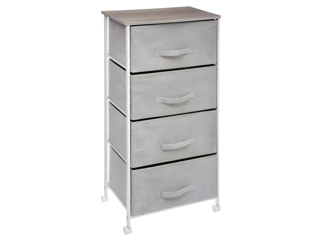 Meuble de rangement sur roulettes à utiliser seul en appoint ou en élément de dressing. Plateau en bois coloris naturel. Structure en métal coloris blanc. Tiroirs en non tissé coloris gris clair. Tiroirs équipés de poignées souples. Roulettes directionnelles. Largeur : 45 cm env Profondeur : 30 cm env Hauteur : 96 cm env. Charge maximale par tiroir : 3 kg. A monter soi-même.