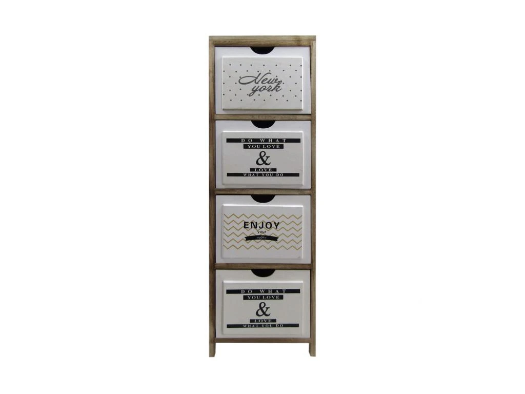 o Dimensions: H 97 cm x L 30 cm x P 24 cm o Dimensions des tiroirs (4): H 20 cm x L 26,5 cm x P 22 cm o Couleur: Blanc, Bois clair, Noir