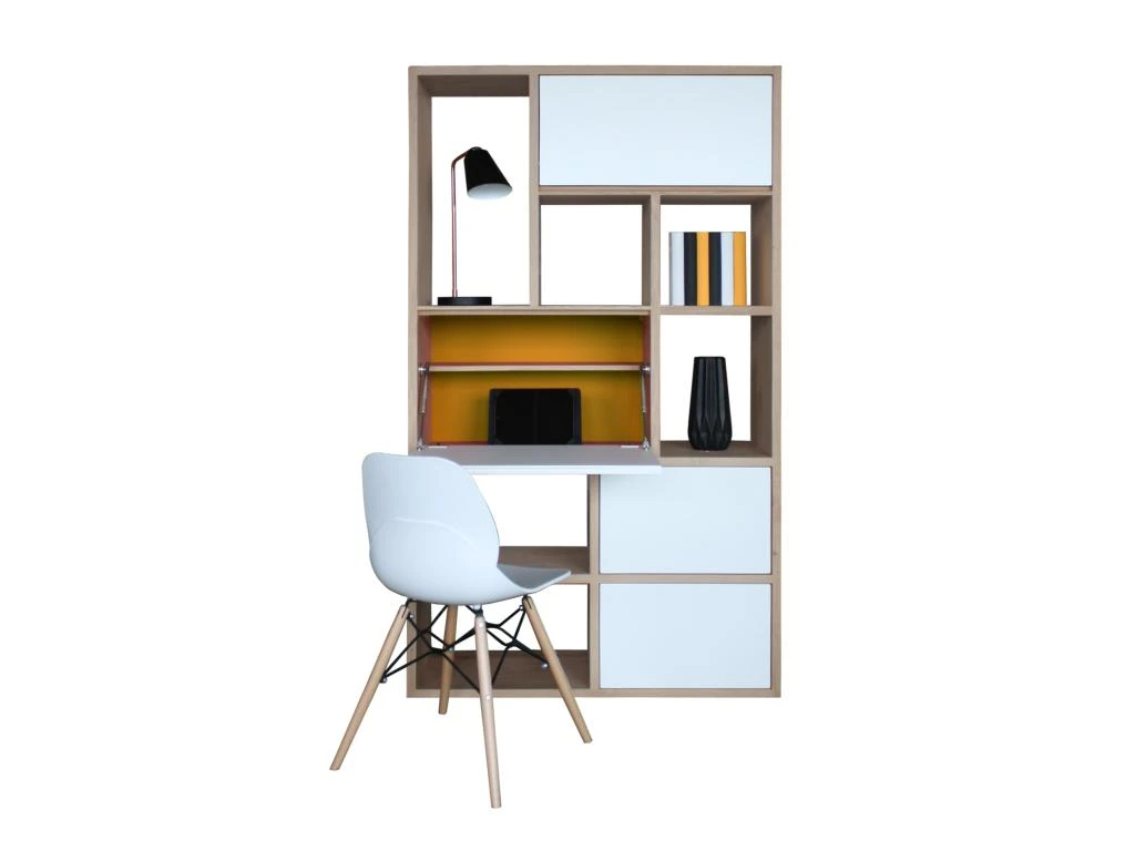 Composition secrétaire en bois massif et laqué, fabriquée artisanalement dans nos ateliers près de Rennes, avec assemblages d’ébénisterie.