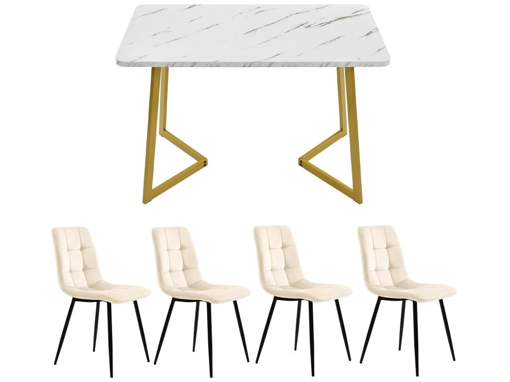 Ensemble Table Et 4 Chaises – Table Dorée 117x68cm – Structure En Métal – Chaise En Velours Beige