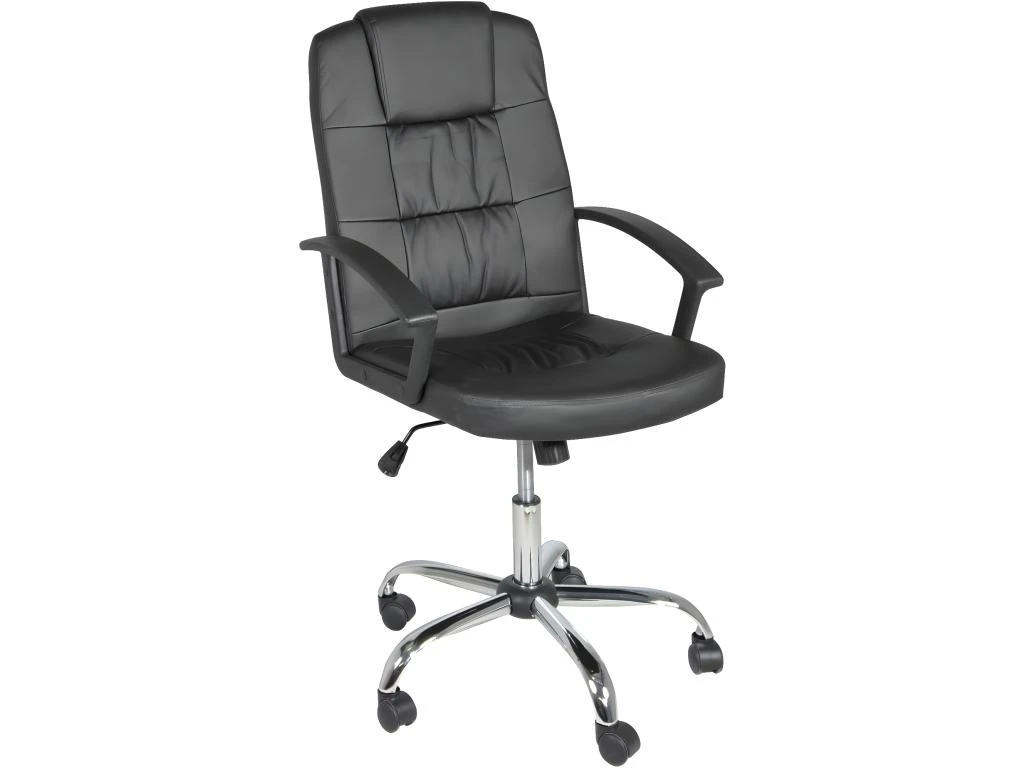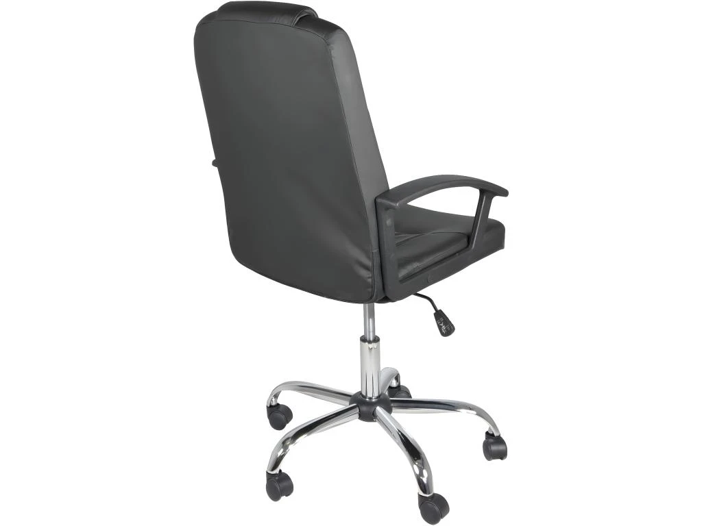 Recouvert de Simili PU Noir, doux au touché, résistant et facile d’entretien. Siège basculant, hauteur d’assise réglable, pivotant à 360° le tout monté sur un élégant pied chromé en étoile équipé de roulettes souples.