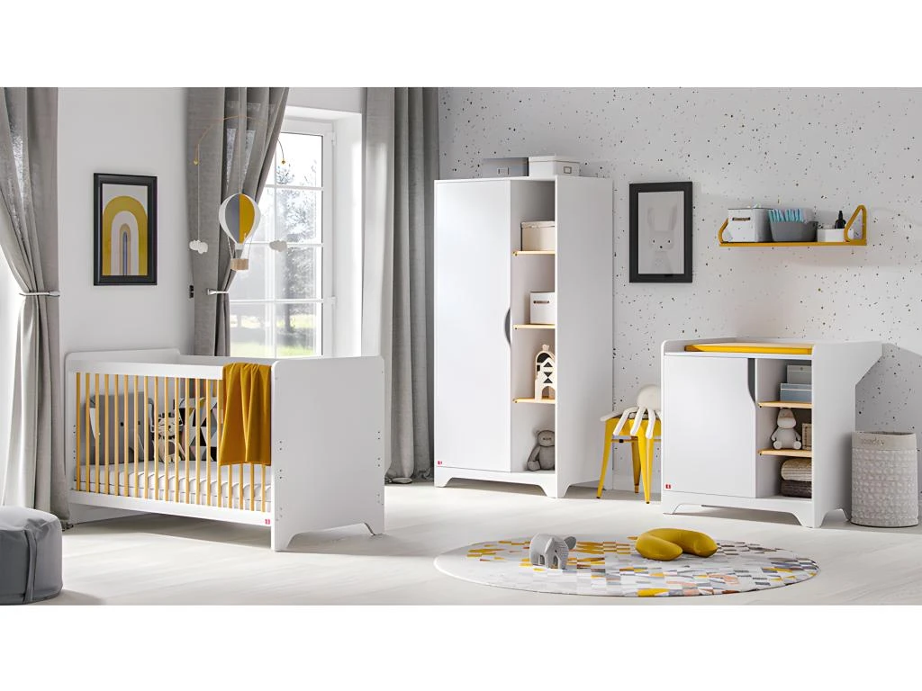 Lit bébé : Barreaux fixes + 3 barreaux amovibles – Sommier inclus réglable en 3 hauteurs – Hauteur du matelas conseillé : 12 cm vendu séparément