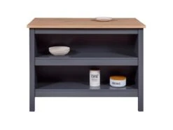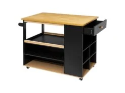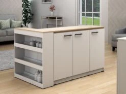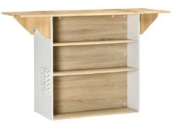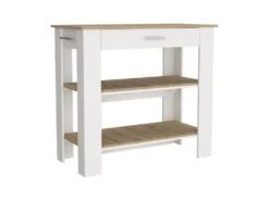 Ilot De Cuisine Table De Bar – 3 étagères, Porte-couteaux Acier Inox. – Blanc Aspect Chêne Clair