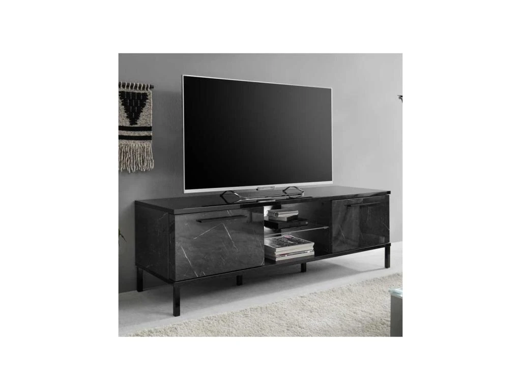 Design exceptionnel pour ce meuble TV 2 portes et son revĂȘtement façon marbre noir brillant Ă la pointe de la tendance.
