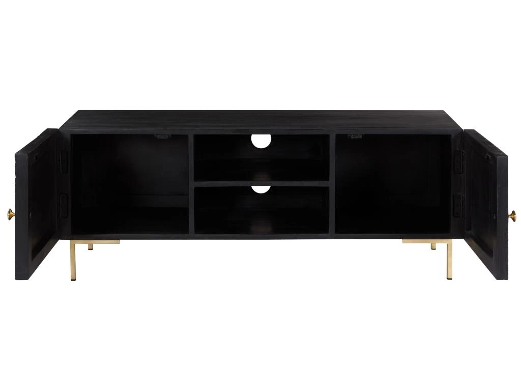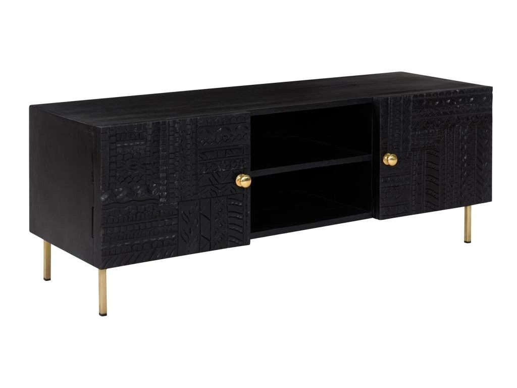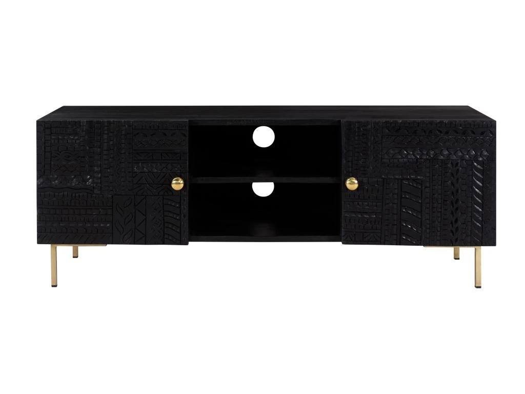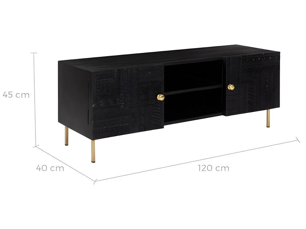 Une fois installé dans votre piÚce à vivre, notre meuble TV Chimane noir imposera sa personnalité créative. Vous apprécierez les motifs gravés qui parcourent ses deux portes et offrent de superbes jeux de lumiÚre. Elles vous permettront le rangement de ce que vous ne souhaitez pas exposer à la poussiÚre et aux regards.