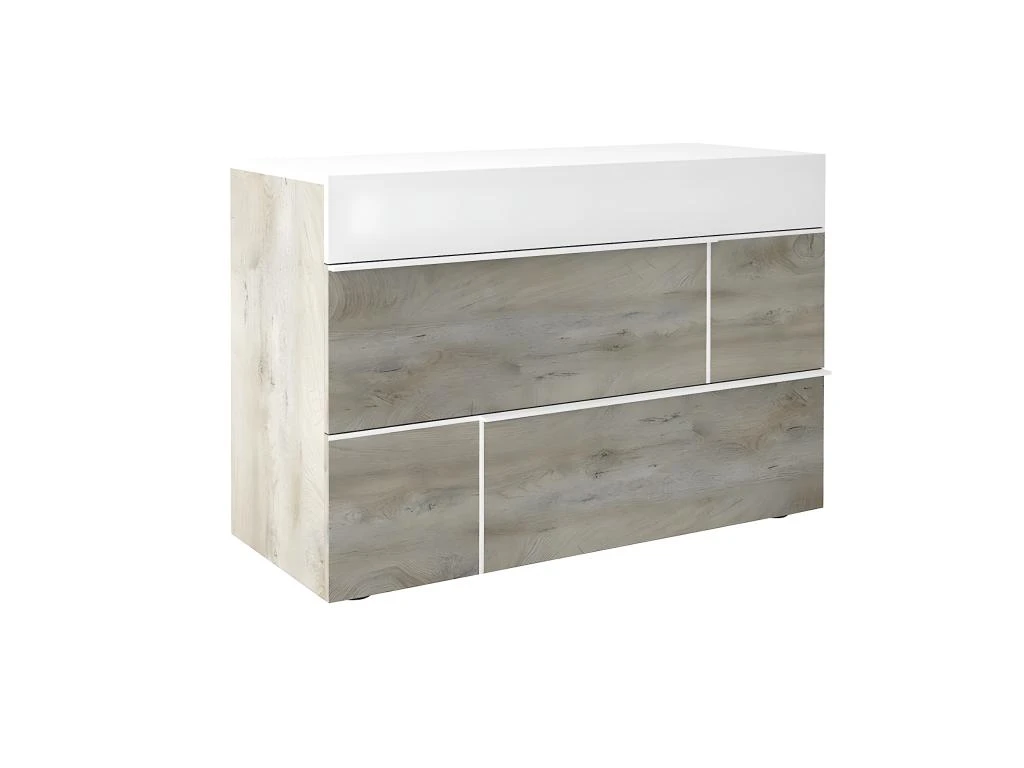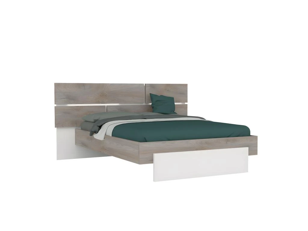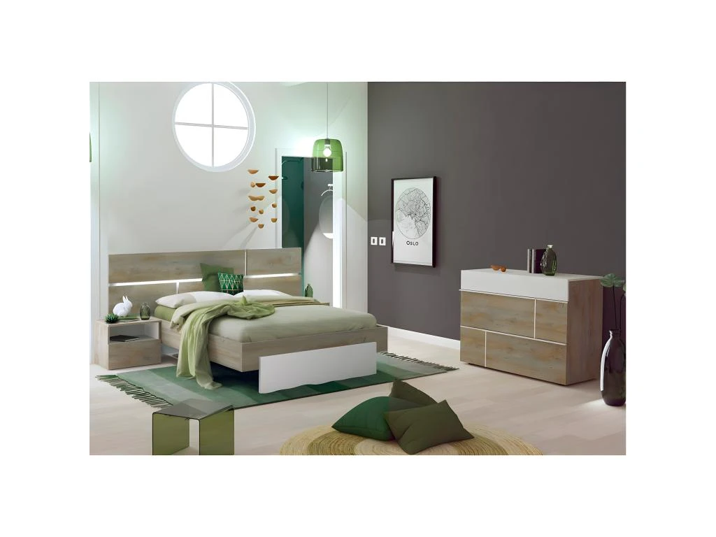 En panneaux de particules, décor laqué blanc mat et bout de chêne. Tête de lit ép.16mm + habillage 28mm. Côtés et pied de lit ép.25mm + habillage 28mm. Leds incluses. Chevet et Commode : ép.18mm