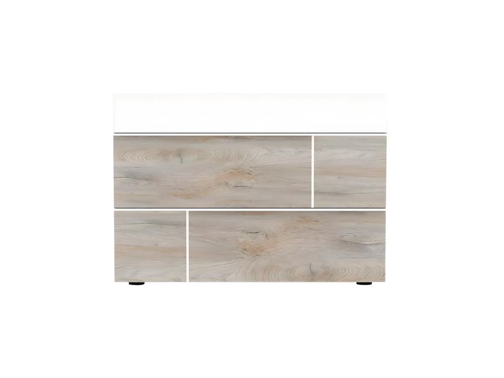 Ensemble composé du Lit 160x200cm avec Leds, de 2 Chevets à Poser 1 Tiroir et de la Commode 3 Tiroirs de la gamme Nino Light, coloris blanc et revêtement effet bois clair.