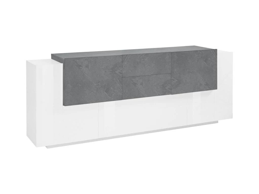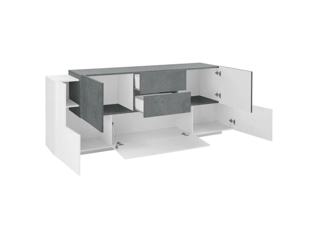 STRUCTURE ET UTILISATION – Buffet de salon pratique et peu encombrant structuré avec quatre portes battantes de différentes tailles, une porte à rabat et deux tiroirs dans la partie centrale, structurés à l’intérieur avec des étagères confortables – Les portes et les tiroirs n’ont pas de poignées, tous deux équipés de charnières solides et guides métalliques – La structure est entièrement en blanc brillant avec des détails Ardoise – L’étagère supérieure est parfaite pour accueillir votre téléviseur ou vos bibelots préférés.