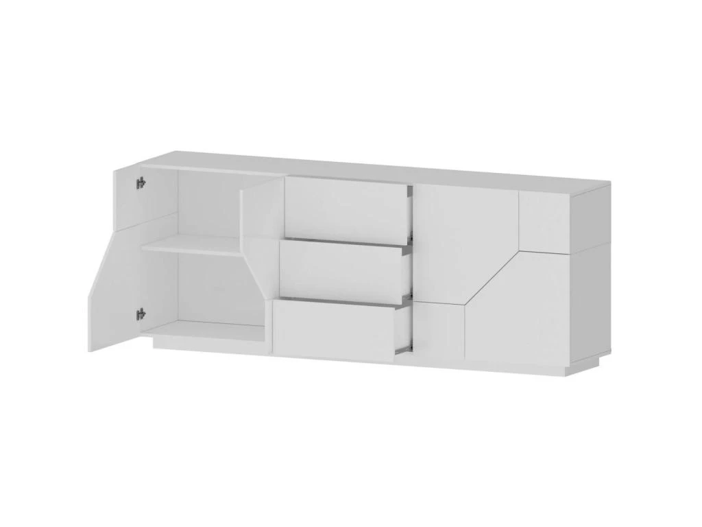 STRUCTURE ET UTILISATION – Buffet de salon pratique et peu encombrant structuré avec quatre portes battantes et trois tiroirs, structuré à l’intérieur avec des étagères confortables – Les portes et les tiroirs sont sans poignées, tous deux équipés de charnières solides et de guides métalliques, l’ouverture se fait par poussoir tirette à système de bouton – La structure est entièrement en blanc brillant – L’étagère supérieure est parfaite pour ranger votre téléviseur ou vos bibelots préférés.