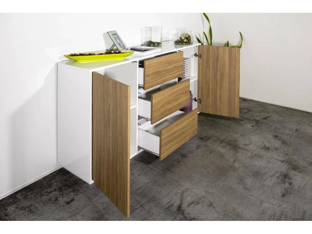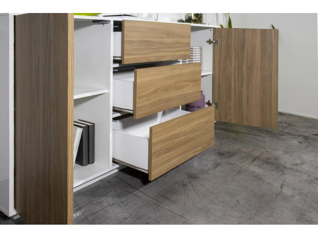 STRUCTURE ET UTILISATION – Meuble de salon pratique et peu encombrant structuré avec trois tiroirs centraux et deux portes battantes, à l’intérieur avec quatre étagères – Les portes et les tiroirs sont sans poignées, tous deux équipés de charnières solides et de guides métalliques – L’étagère supérieure fait de ce buffet une porte meuble TV où vous pourrez ranger vos bibelots préférés – Ce meuble est parfait pour décorer la salle à manger, le salon, le couloir, l’entrée ou le bureau, contenant de la vaisselle, des verres, des nappes, des couverts, des livres, des documents ou des objets de décoration dans un de manière ordonnée.
