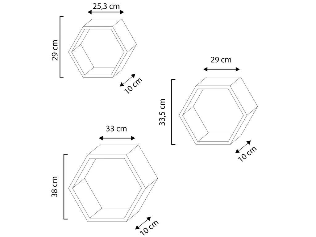 · Étagère hexagonale moyenne: 29,5 cm (longueur) x 10 cm (largeur) x 33,5 cm (hauteur)