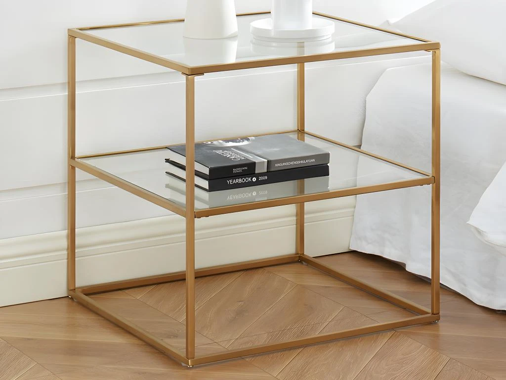 Munie de deux plateaux en verre trempé et d’une structure en acier inoxydable, la table de chevet KOHANA est le meuble de rangement idéal pour une déco moderne et minimaliste.