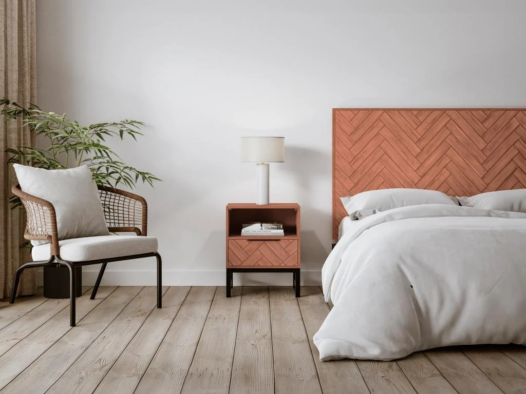 La table de chevet VEDILA saura vous charmer avec son sublime bois d’acacia. L’effet chevronné de cette table de nuit apportera une dimension artistique unique à votre pièce, ajoutant une sensation de mouvement et de dynamisme à l’ensemble de votre décoration ! Dotée d’un tiroir et d’une niche, gardez votre chambre organisée et dégagée dans toute circonstance.